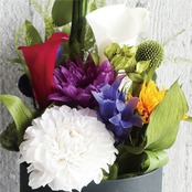 Φ10cmのボックスにダリアやカラーリリーをメインに菊・りんどう等の花々が入った落ち着いた印象のボリューム感たっぷりのフラワーボックスです。