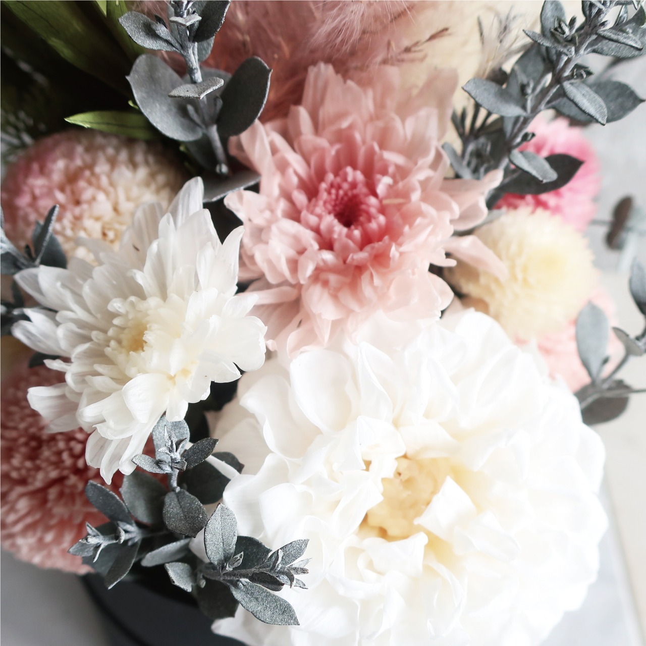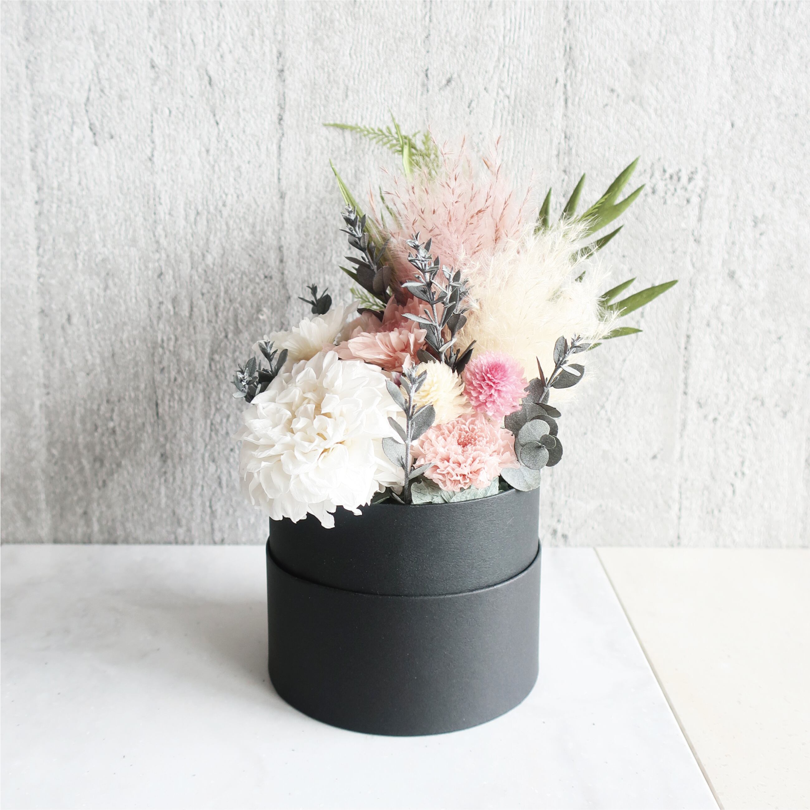 Φ10cmのボックスにダリアをメインに菊・千日紅等の白とピンクの花々が入った優しい雰囲気のフラワーボックスです。
