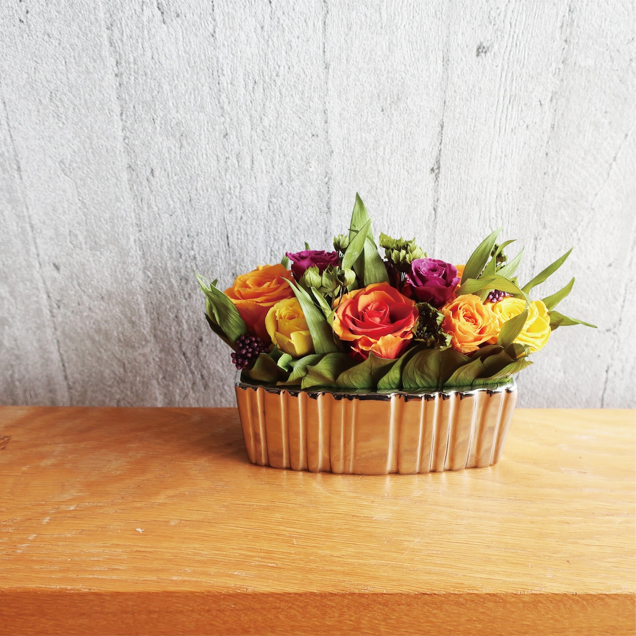プリザーブドフラワーは色落ちする事がありますので、飾る際花材の色落ちに十分ご注意下さい。