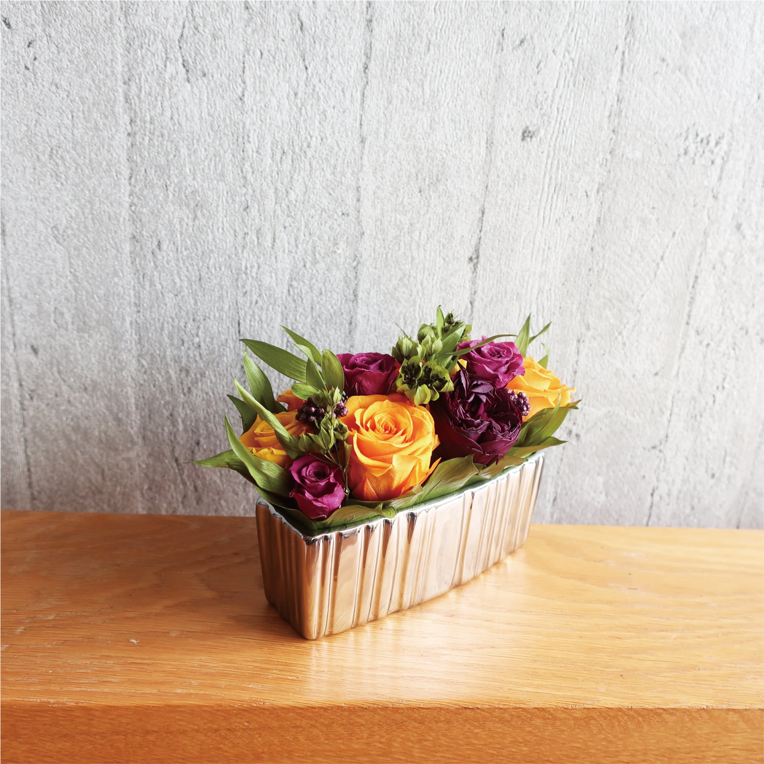 シルバーの花器にパープル・イエロー・オレンジのローズ等が入ったフラワーアレンジメントです。