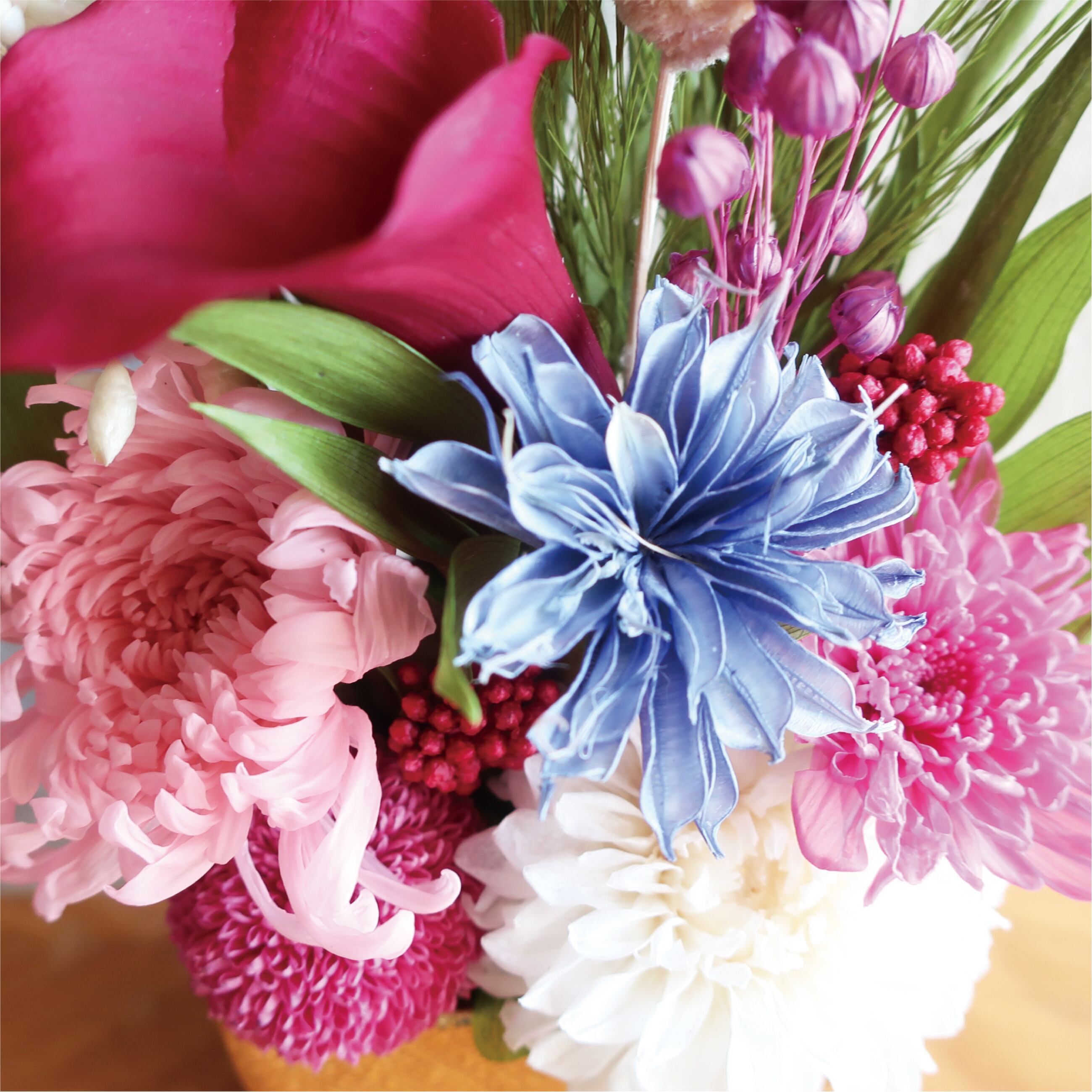 天然素材を加工したお花ですので、色の吸い上げ・着色に個体差があり花材の入荷状況により色味や大きさが画像と違いが出る場合があります。