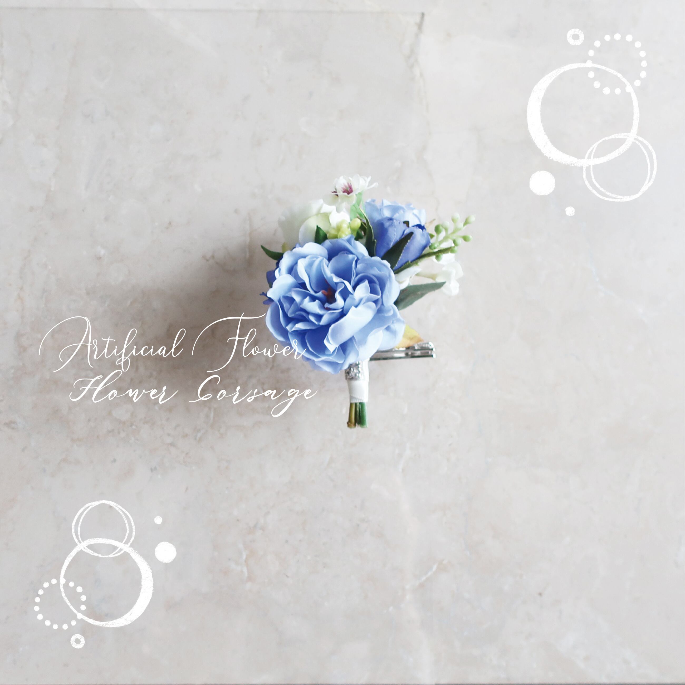 可愛いブルーローズをメインにビバーナム等の花々が入ったコサージュです。