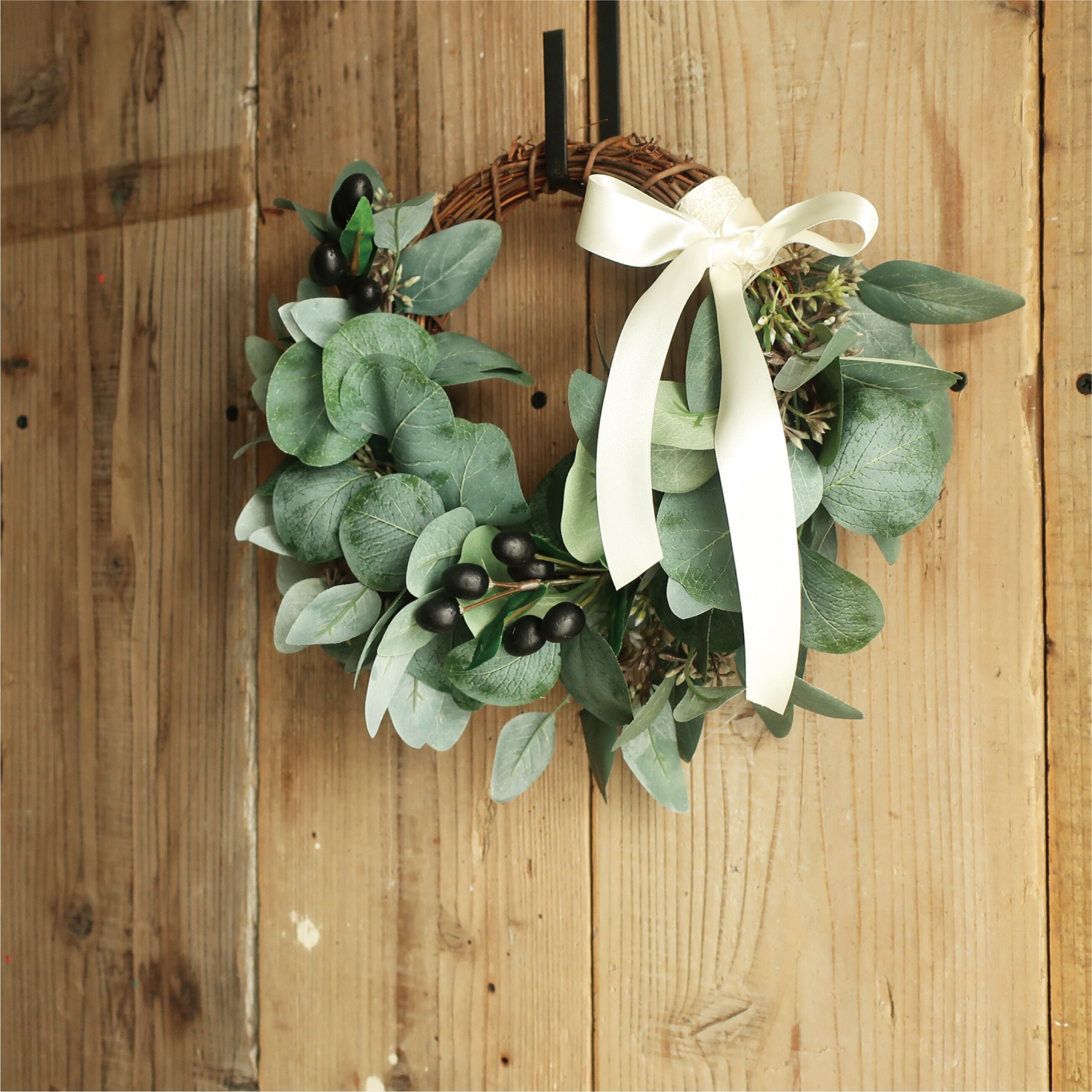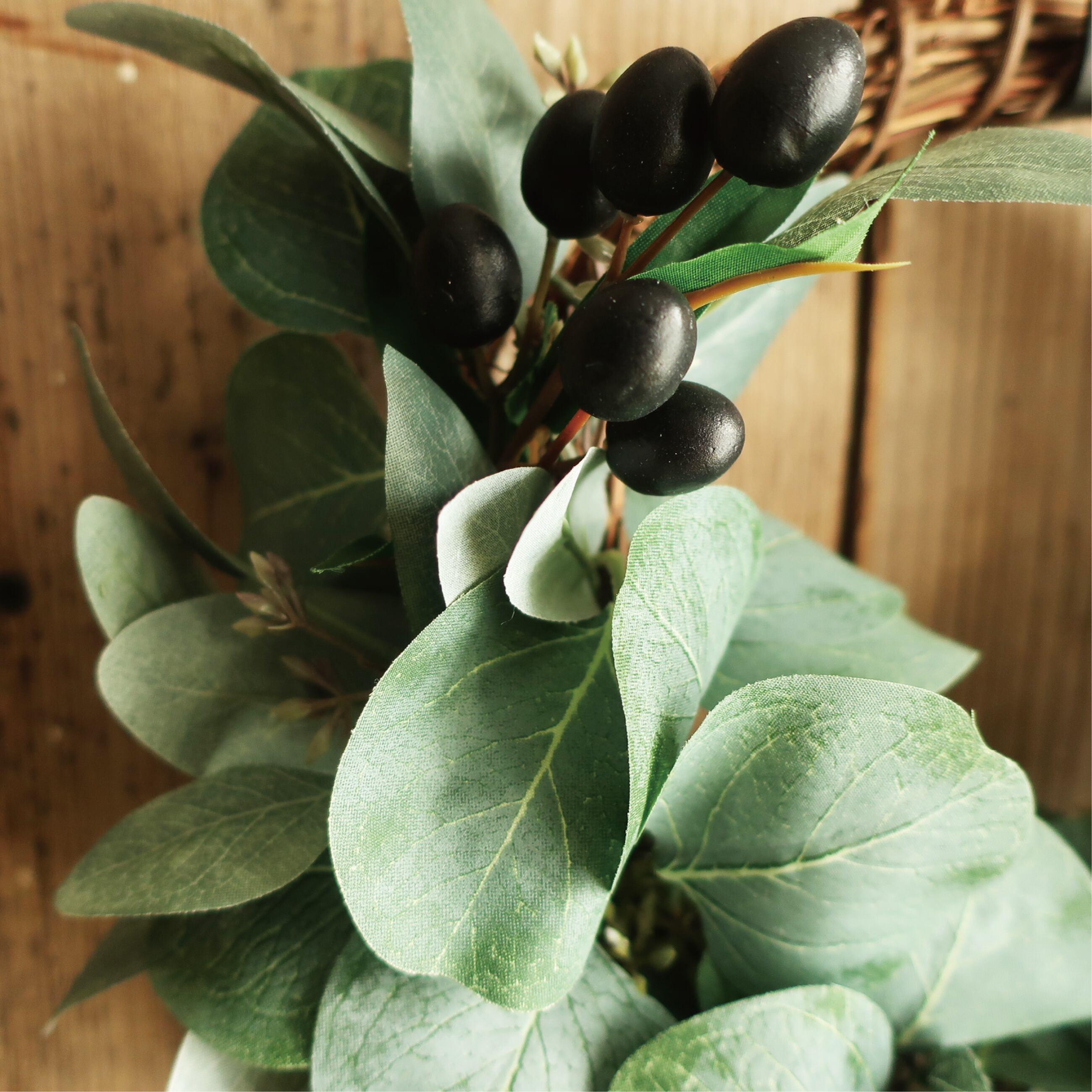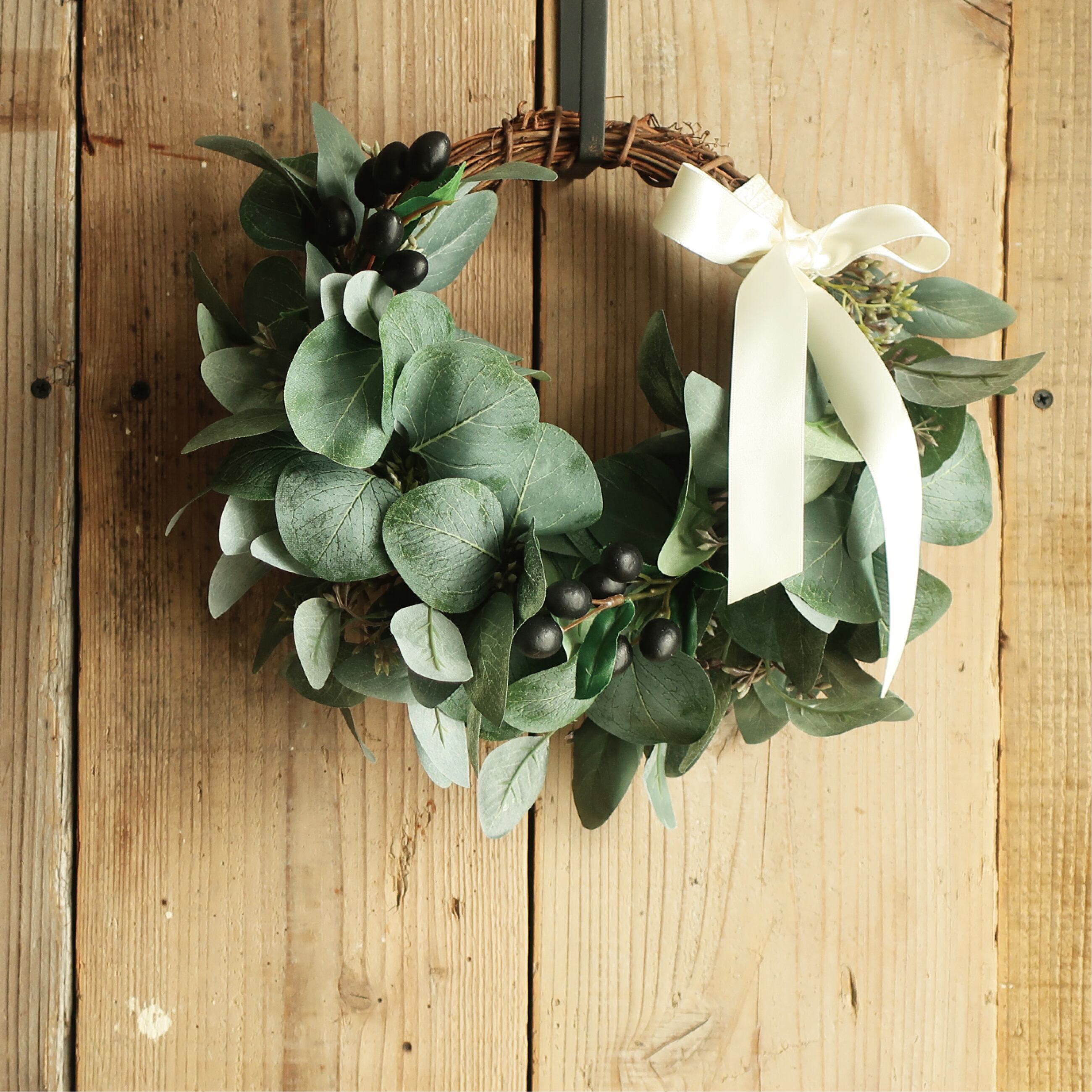細葉・丸葉ユーカリとオリーブのインテリアに合わせやすいグリーンリースです。