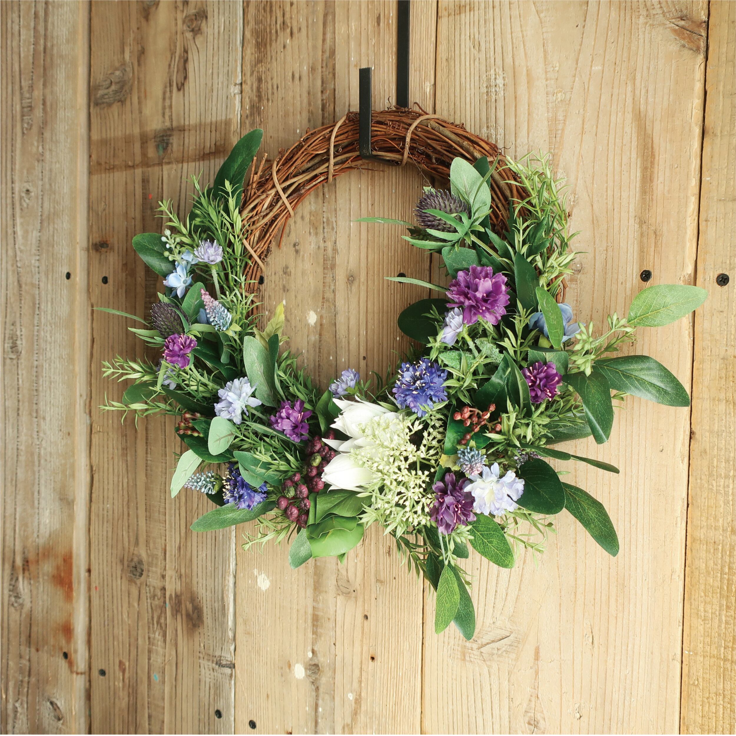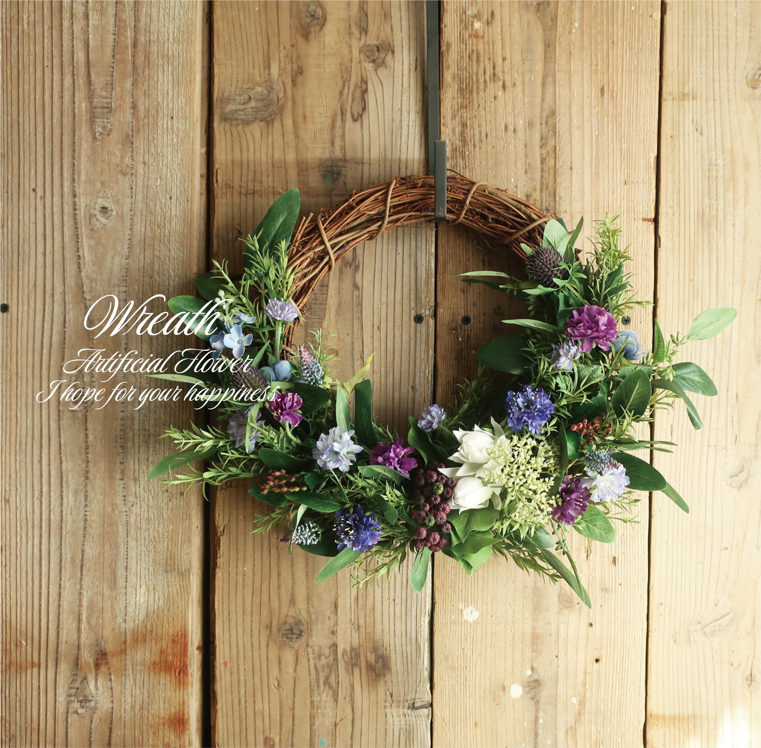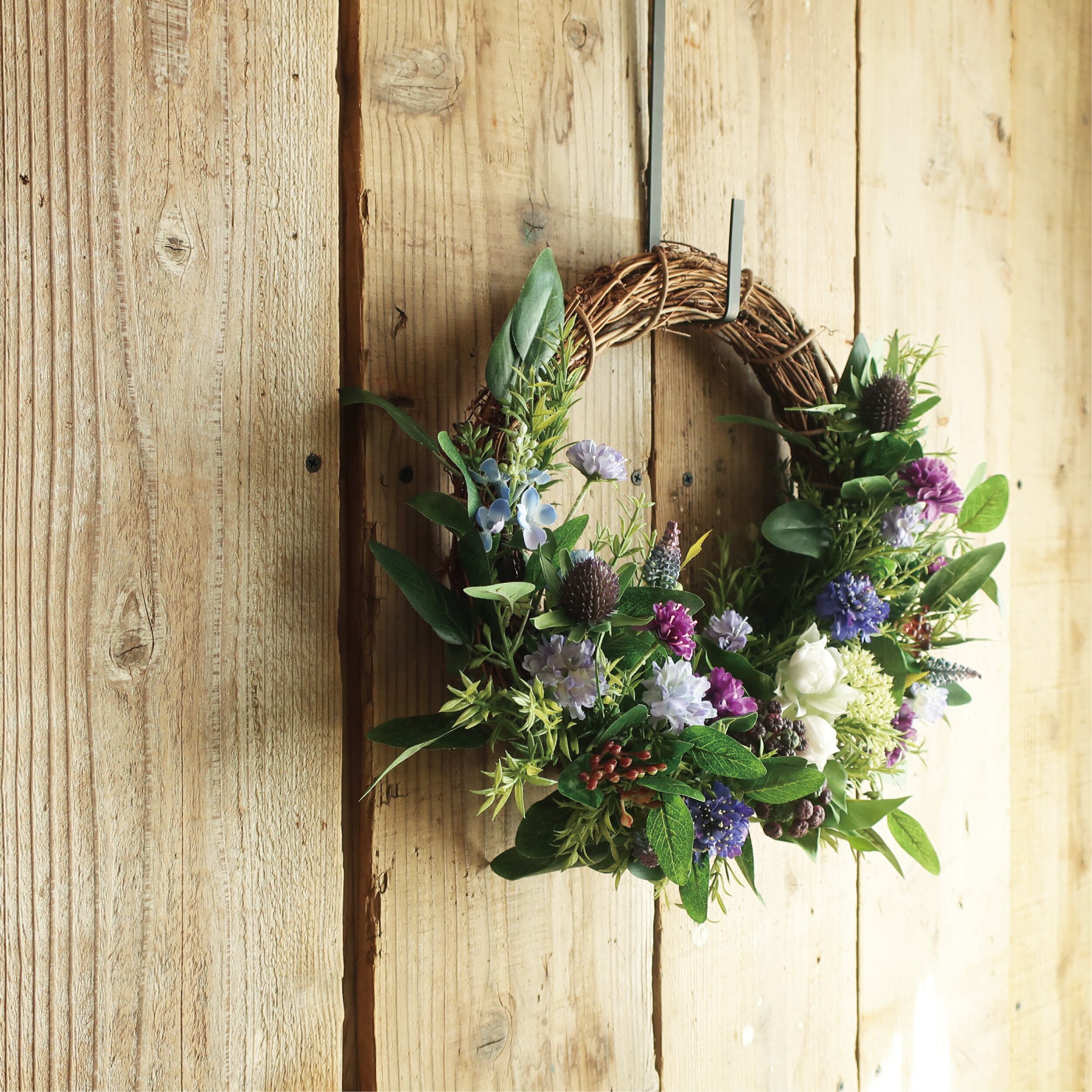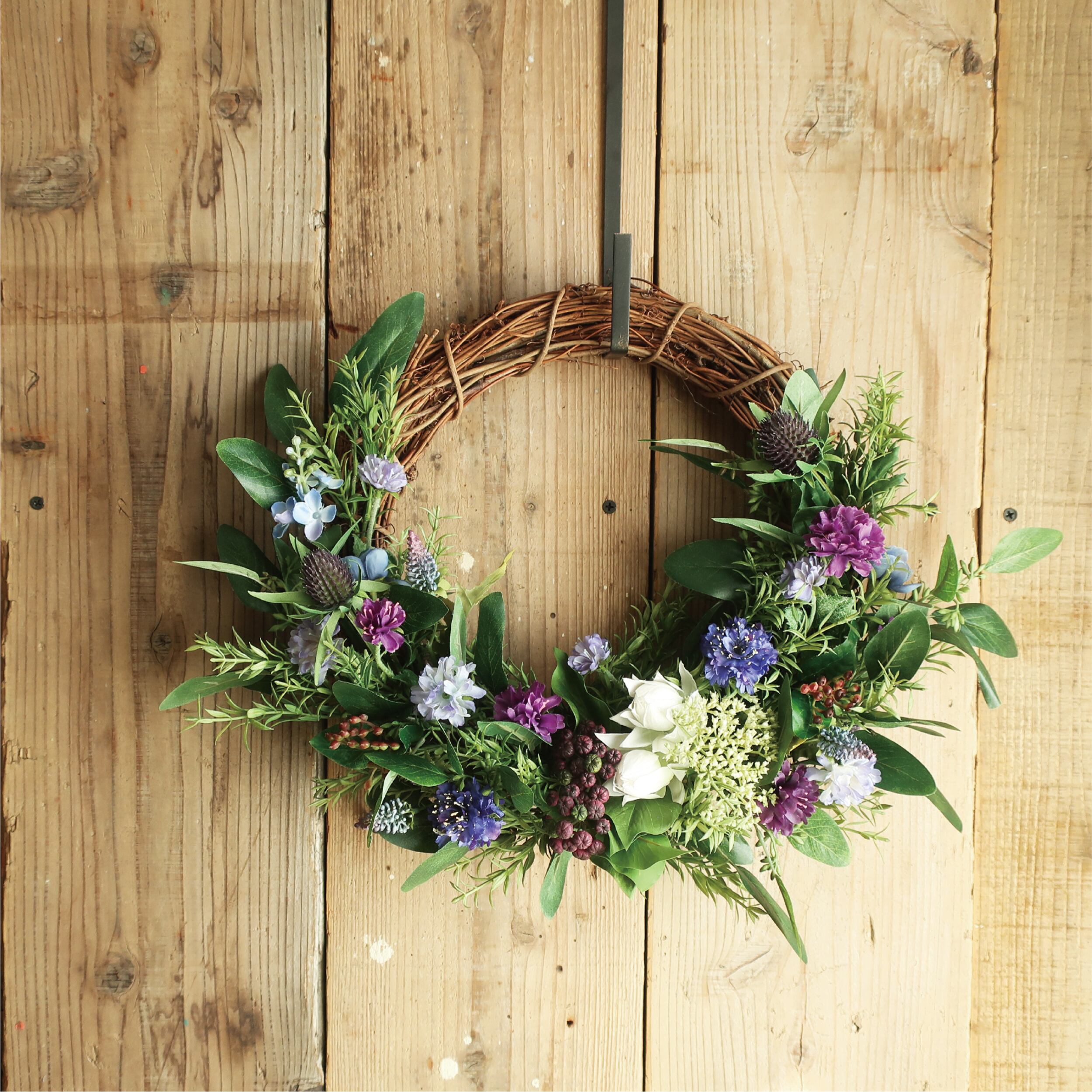 パープルやブルーのコーンフラワー・エリンジウム・セルリア等の花々が入ったハーフリースです。