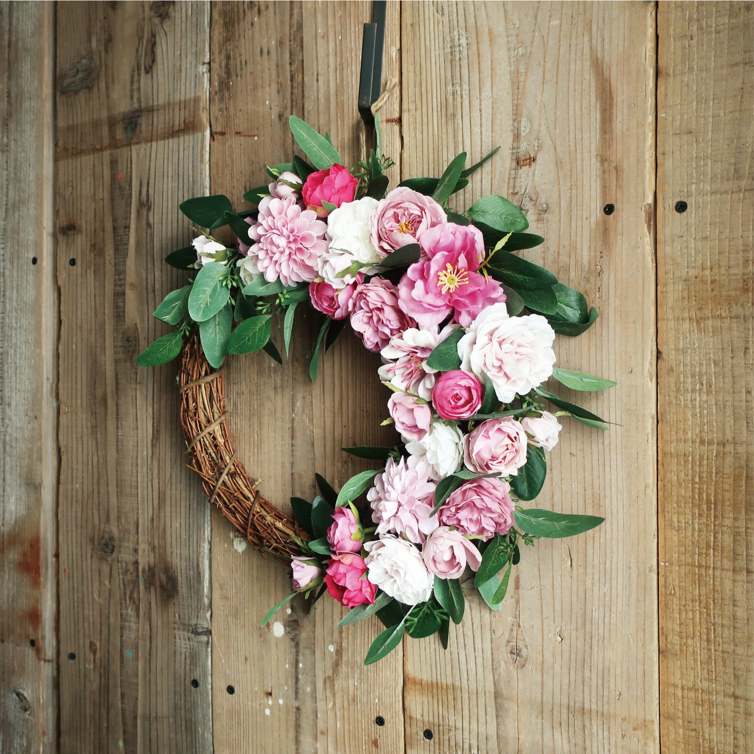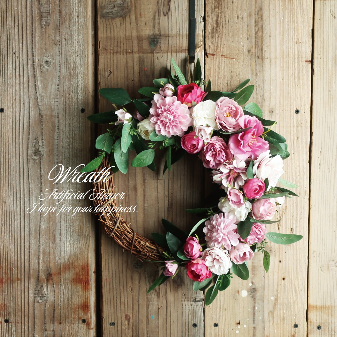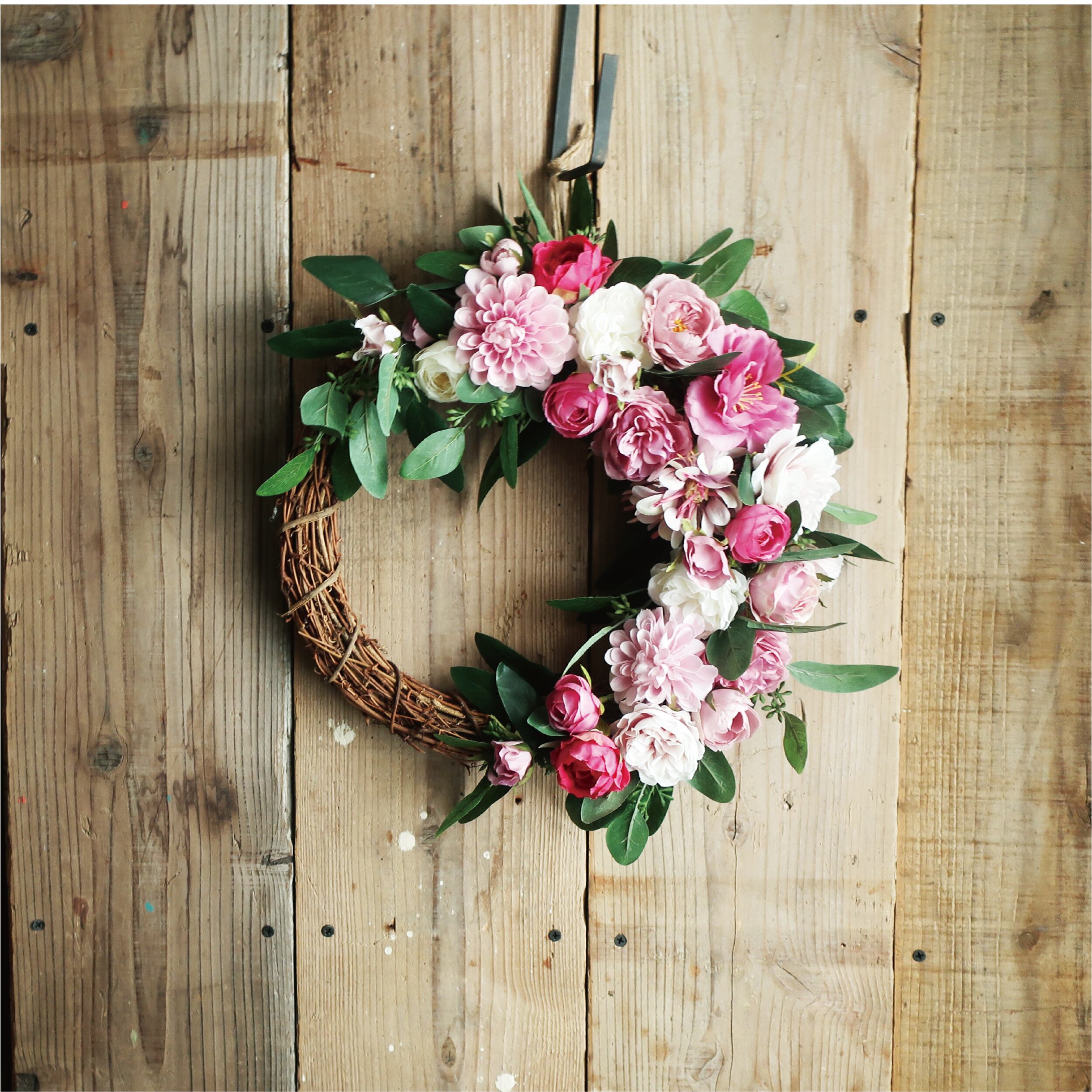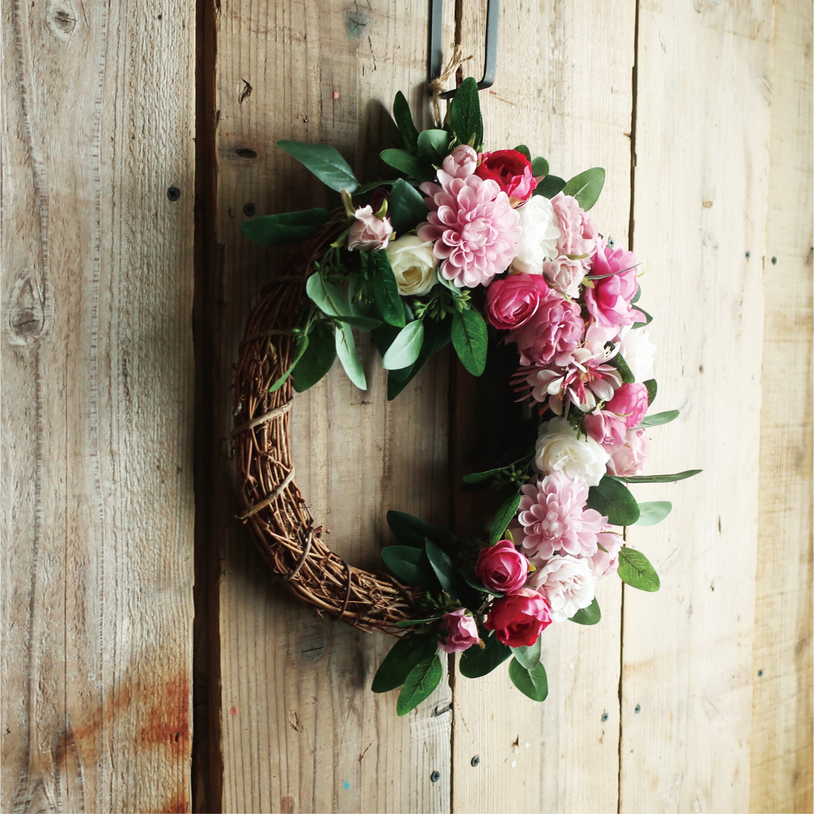 ピンクのローズをメインにダリア・ラナンキュラス等が入ったリースです。