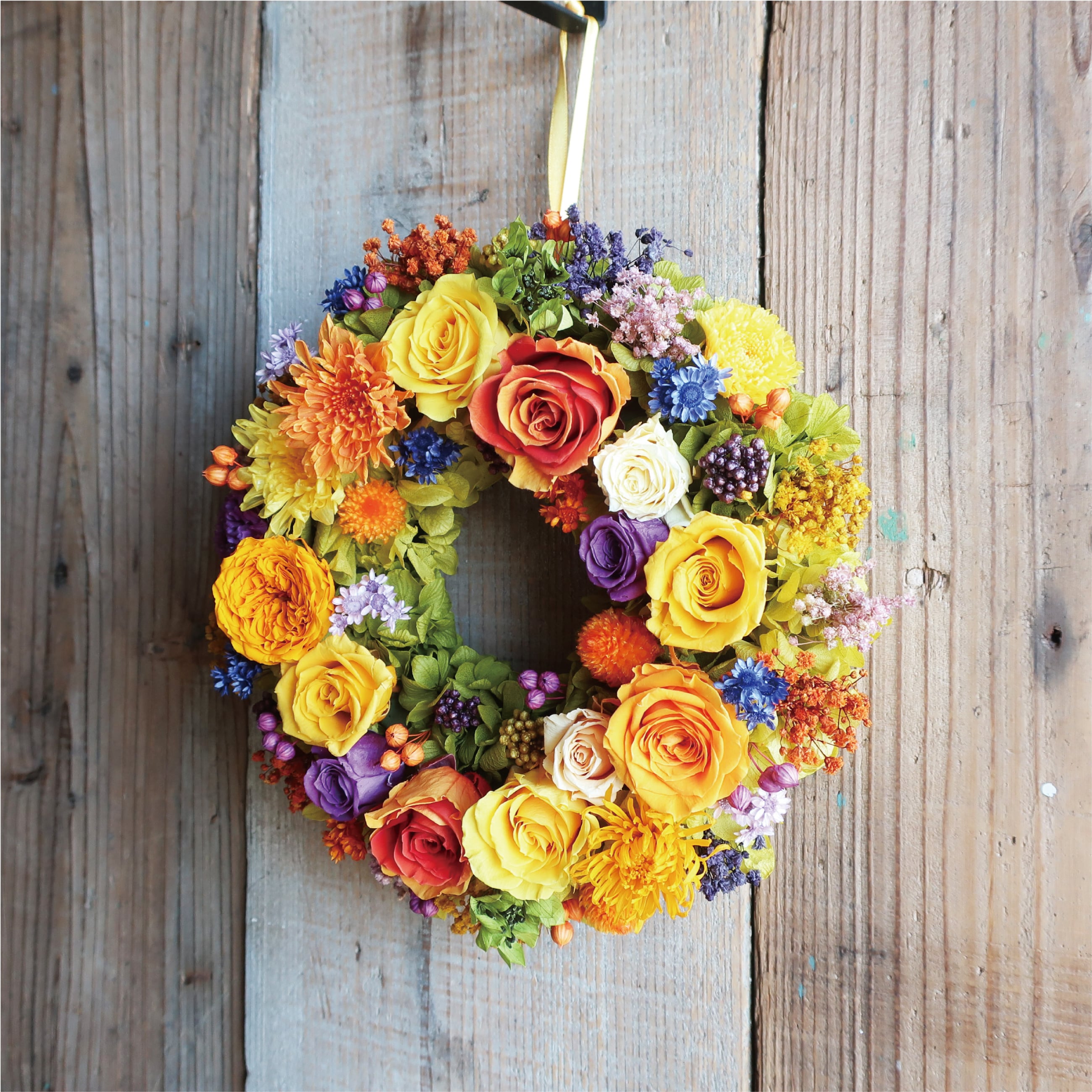 イエロー・オレンジ・パープル等のローズや小花がたっぷり入ったリースです。