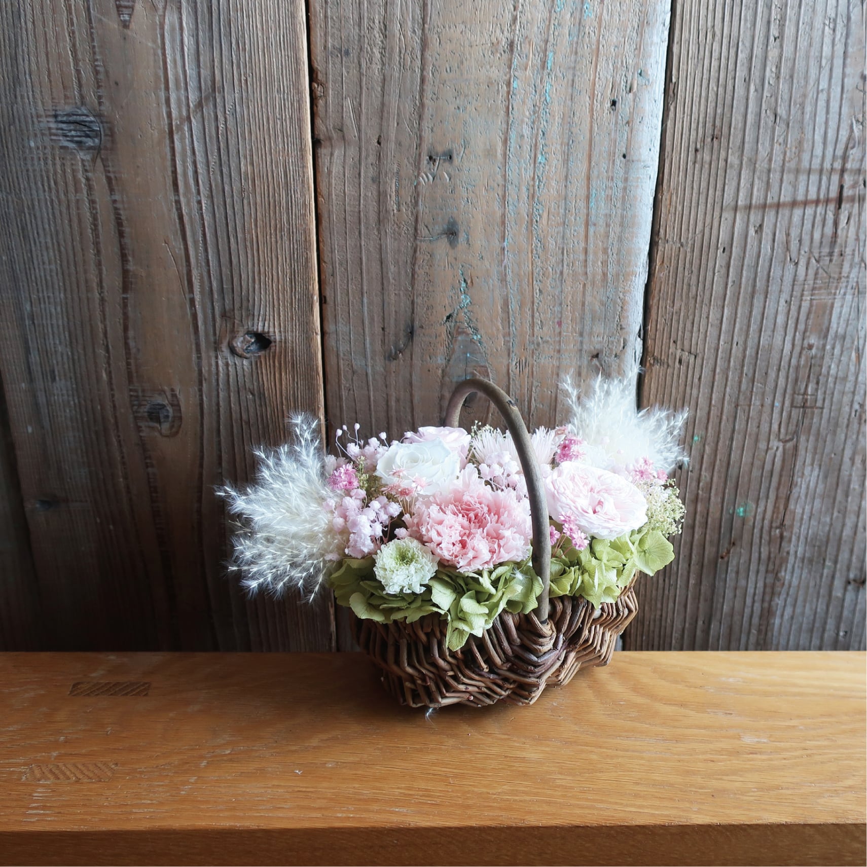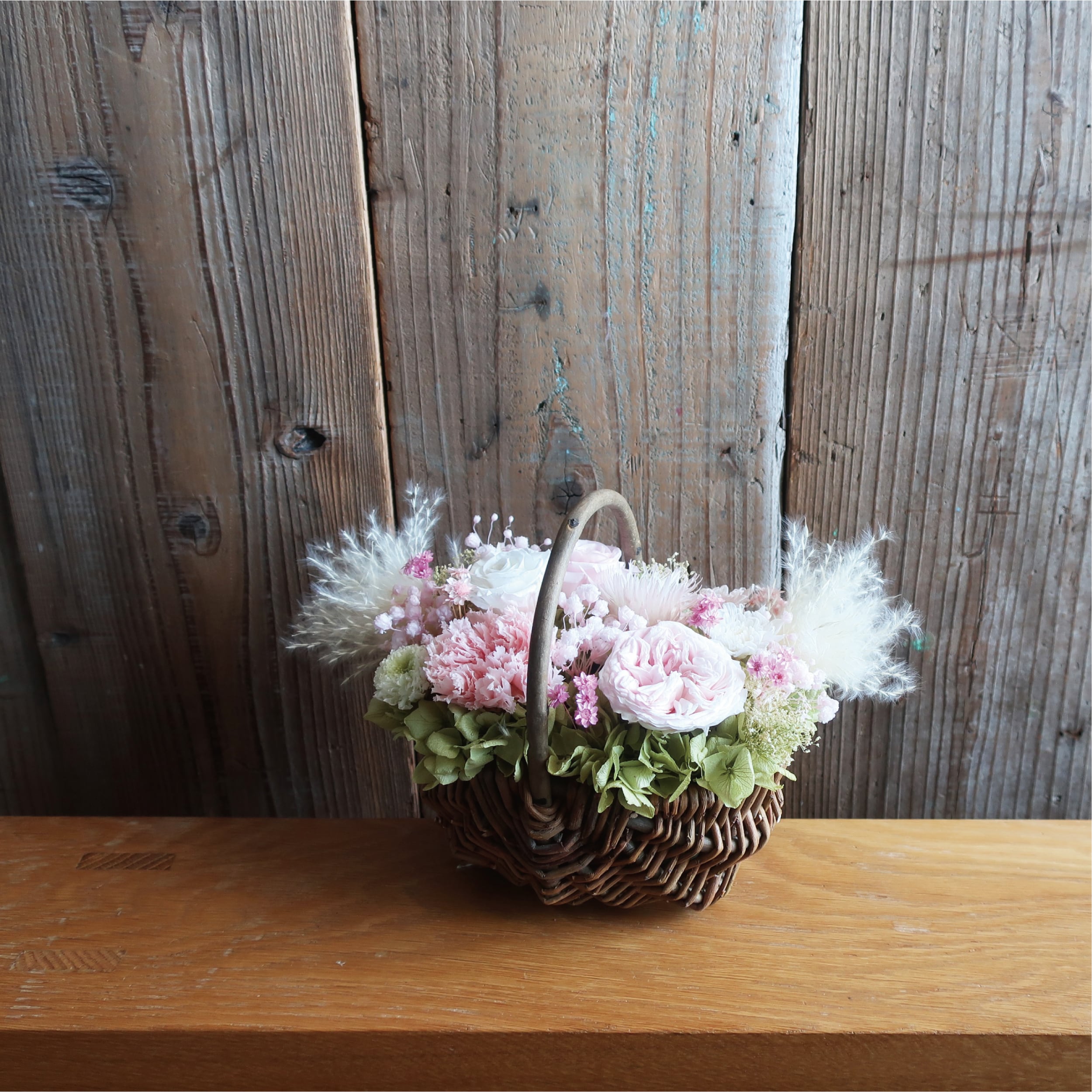 ローズ・カーネーション・シルバーデージー・菊・かすみそう等やさしいピンクやホワイトの花々が入ったバスケットです。