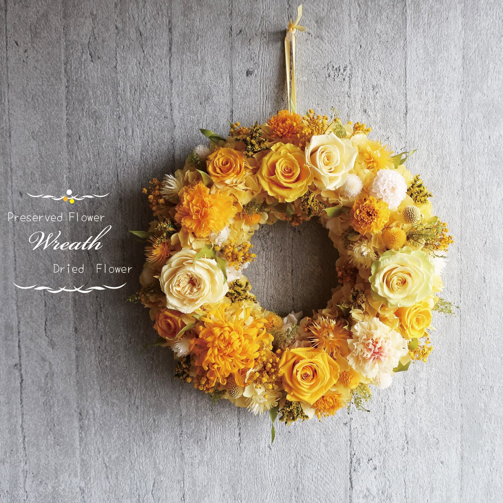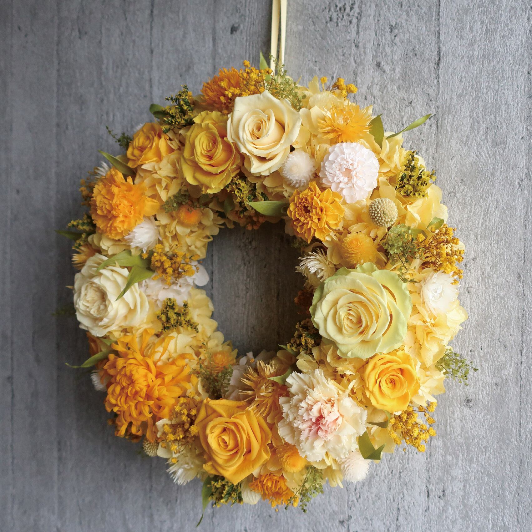 ミモザイエロー色のローズ・シルバーデージーやマム・ダリア・カスミソウ等沢山のイエローの花々が入った約φ31cmの大きめリースです。