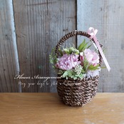 ピンクのローズやカーネーション・ライスフラワー・ペッパーベリー等が入った小ぶりで可愛いバスケットに仕上げました。