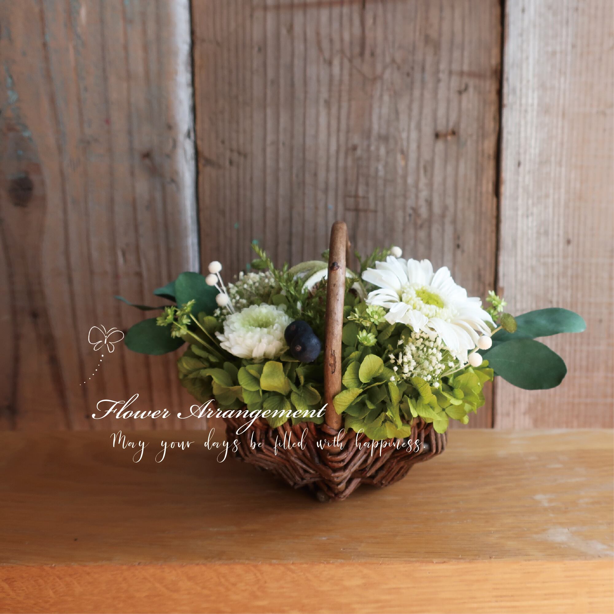 白いガーベラが目を引くミニバスケットです。