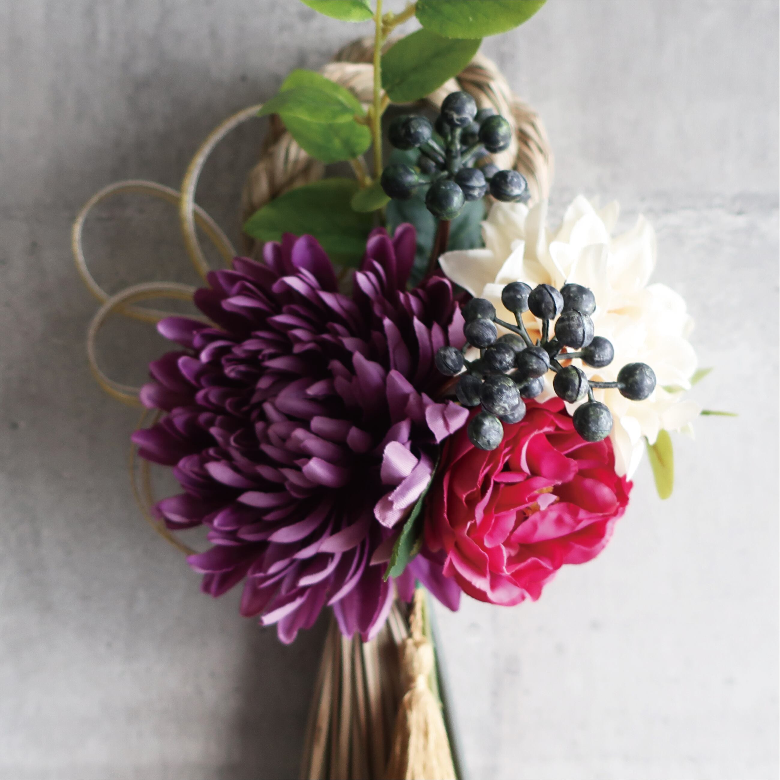 紫の重ね菊をメインにローズ・ダリア等の花々にゴールドの水引の花飾り・タッセルをお付けしたしめ縄飾りです。