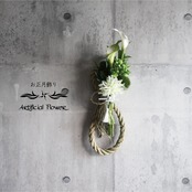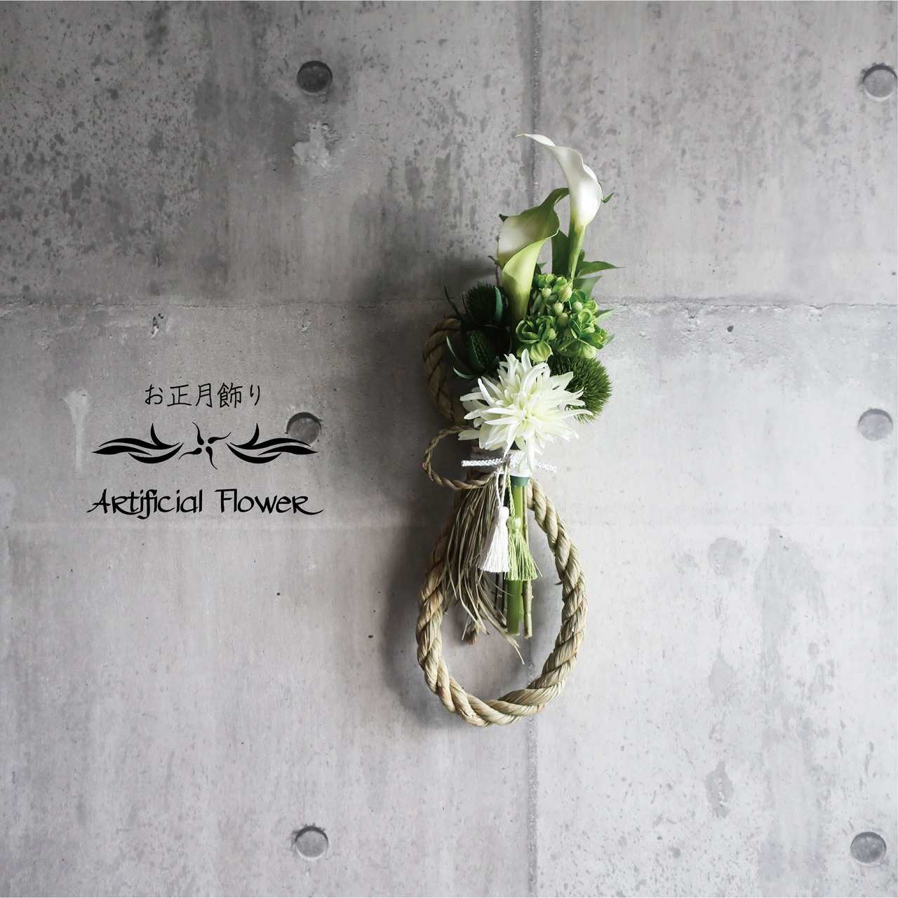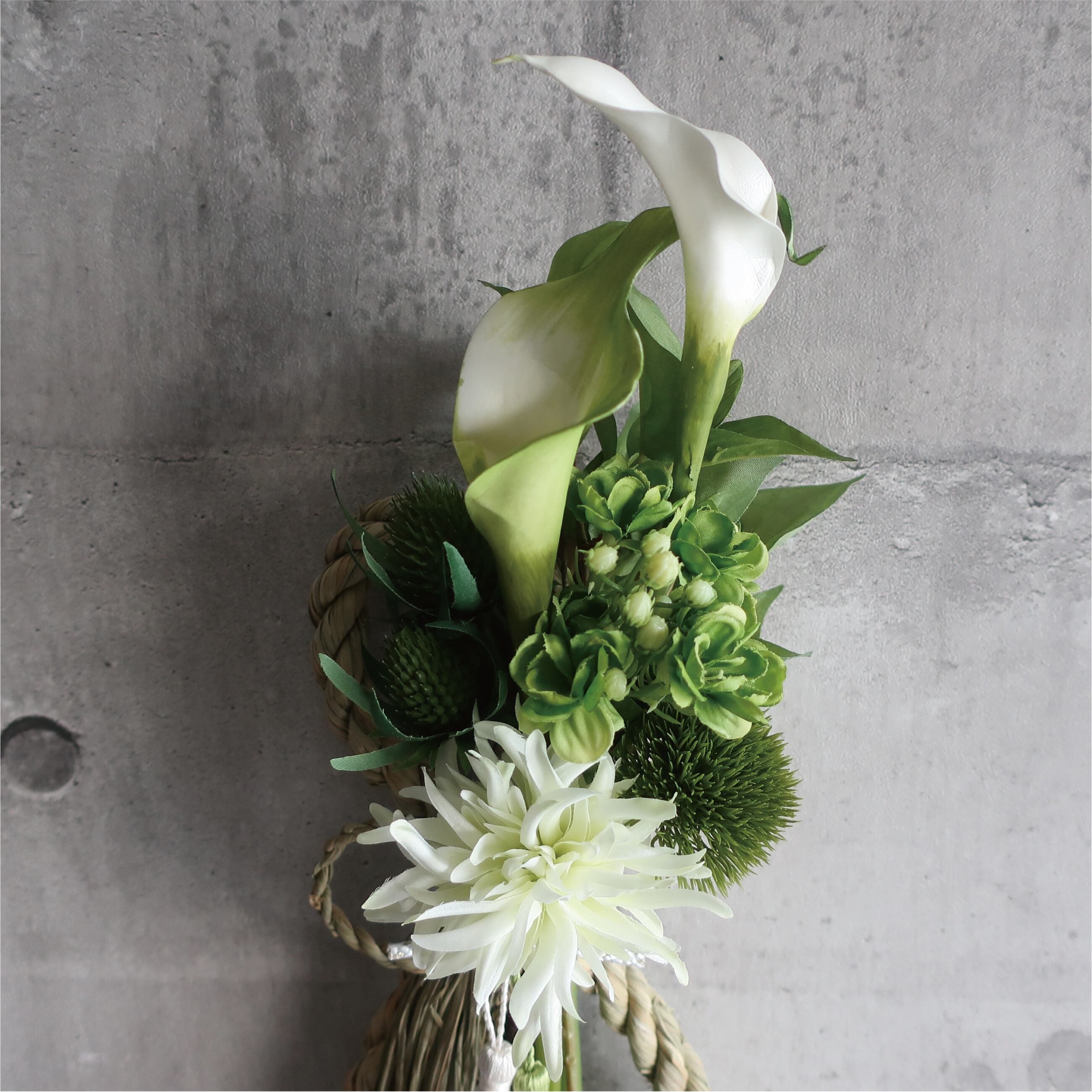 ダリア・カラー・ジャスミン・テマリソウ等ホワイトグリーンの落ち着いた雰囲気の和モダンなしめ縄飾りです。