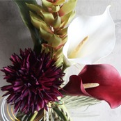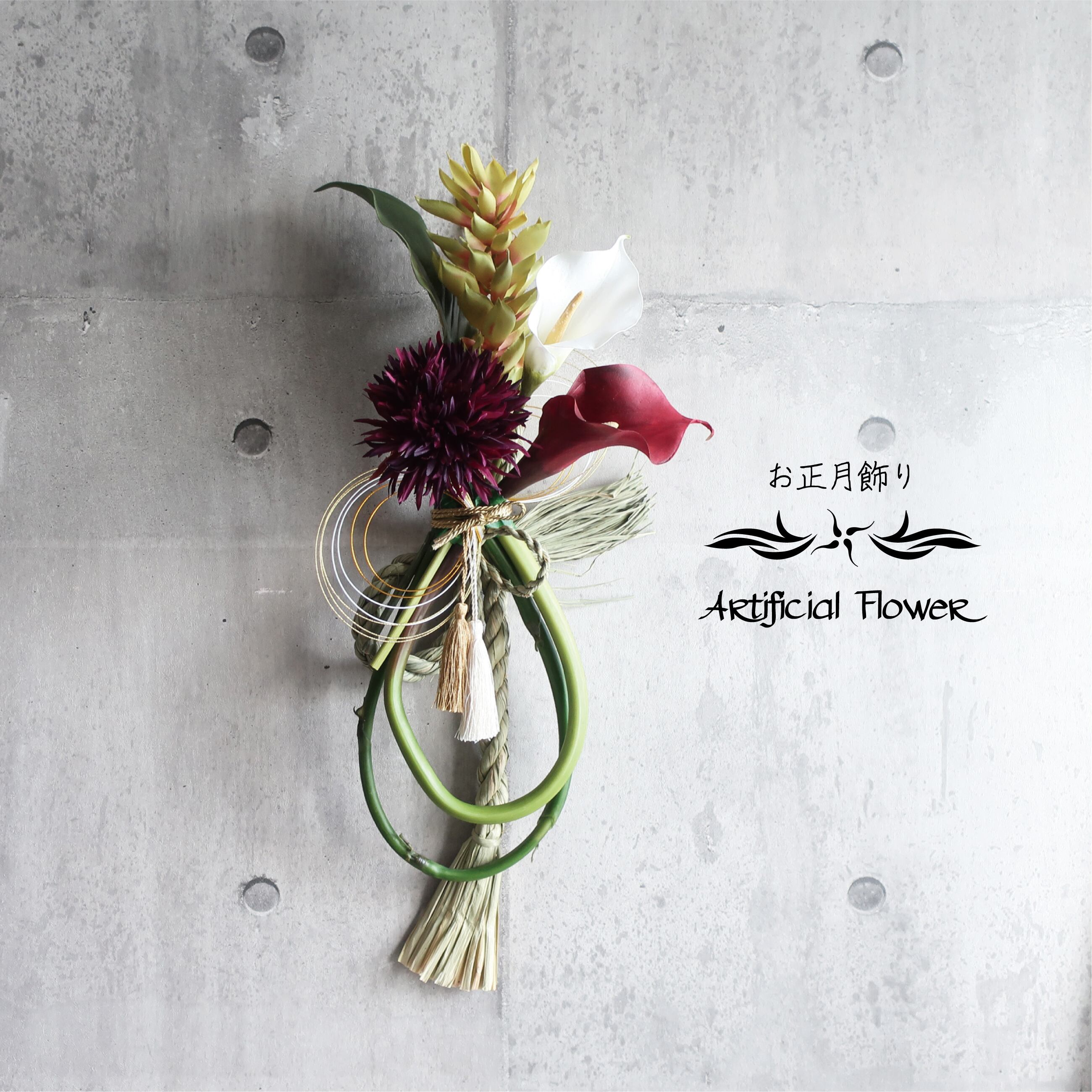 ジンジャーリカルダ、紅白のカラー、マムの花々の個性的なしめ縄飾りです。